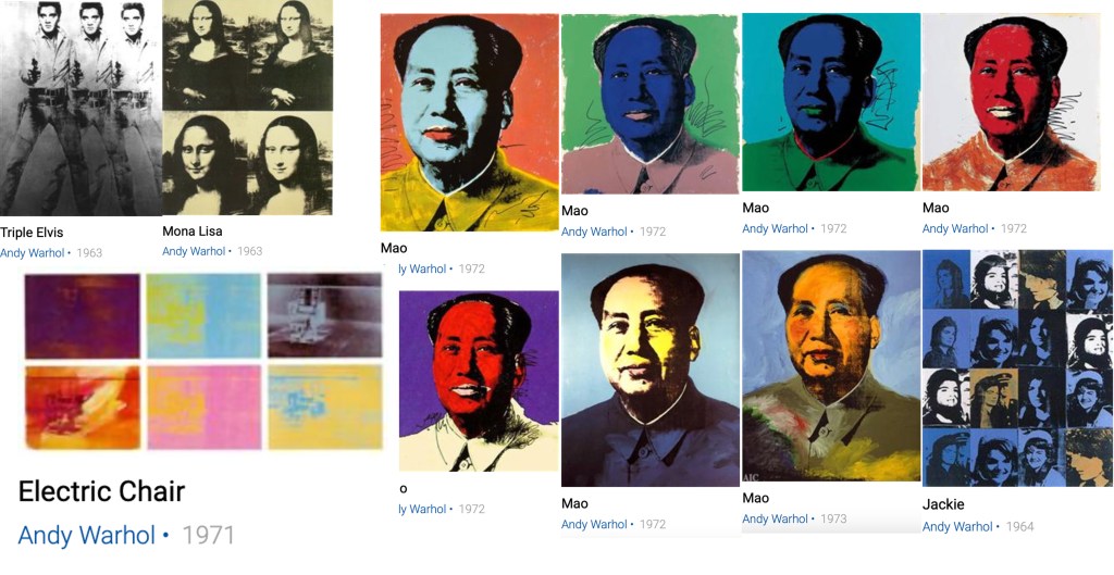 This image in my imagination sparked the idea to look at Andy Warhol’s work. Andy Warhol’s Nine Jackies(1964) came to mind, as well as Mona Lisa (1963), Mao (1972) and Triple Elvis (1963). I also liked Andy Warhol’s colours in Electric Chair (1971).