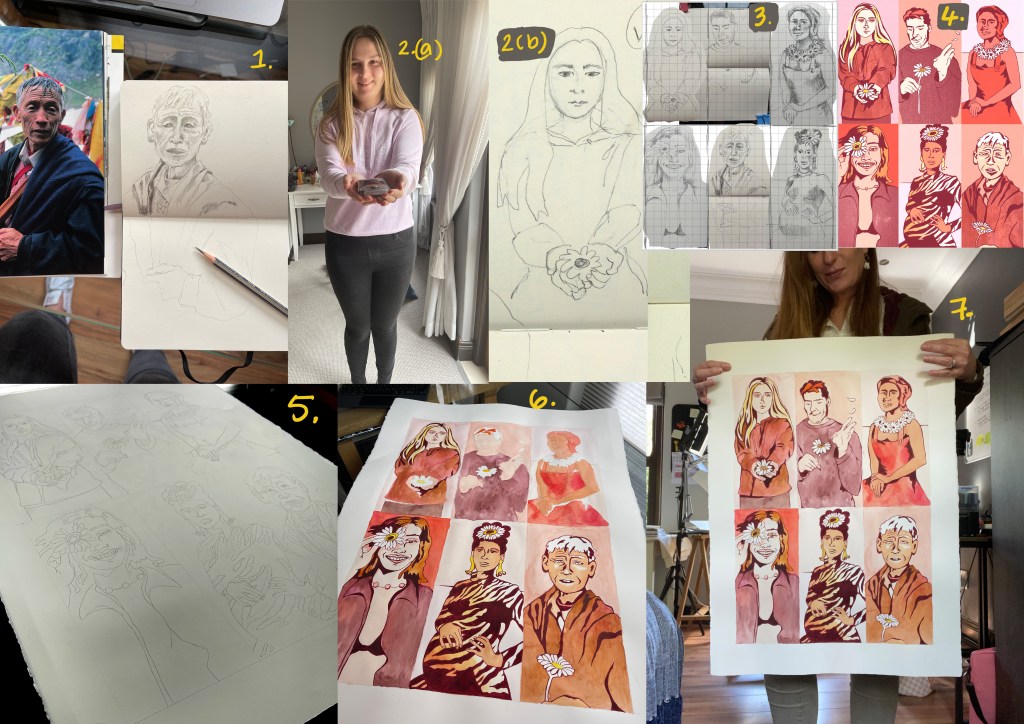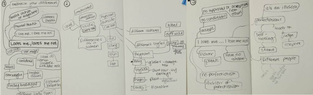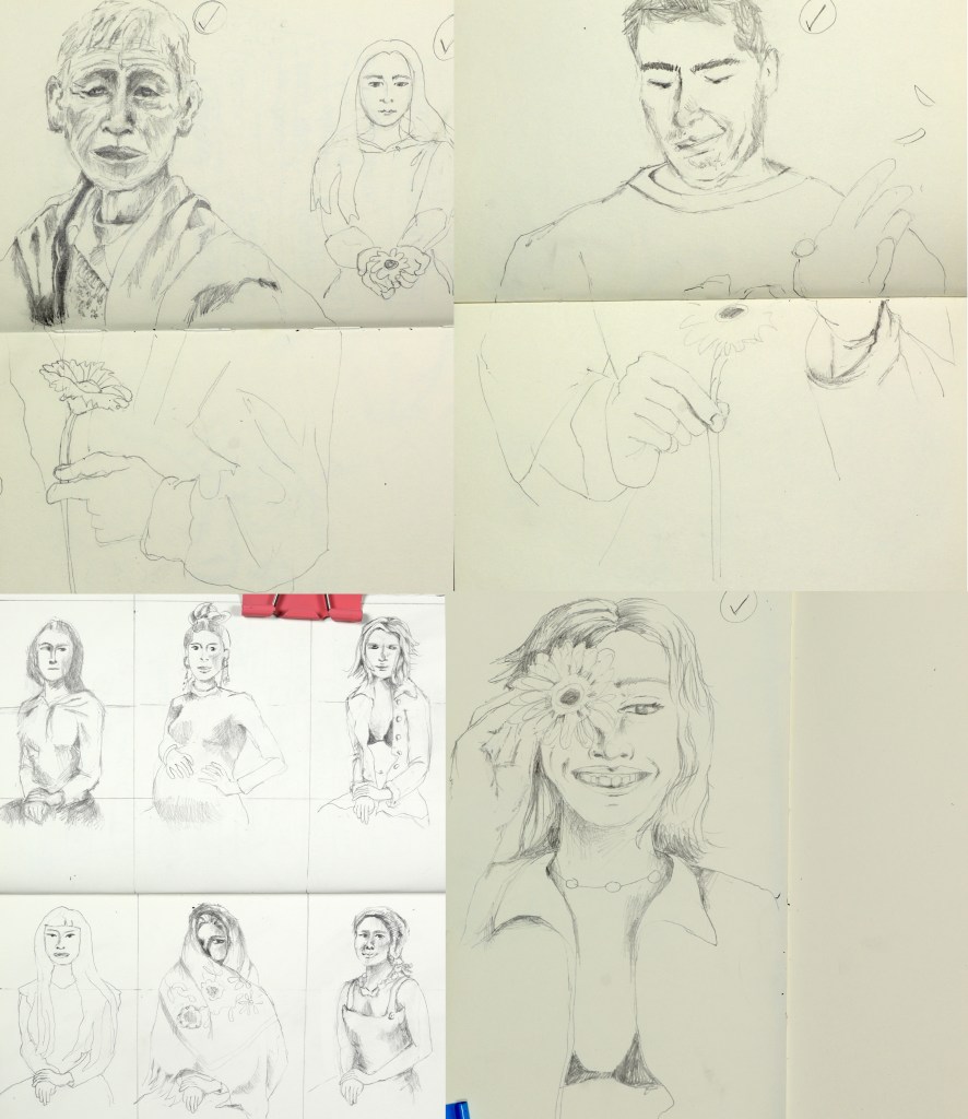 Once I had the six women down on paper, all sitting in the same position (bottom left, figure 6), I felt it needed more interaction with the game “loves me, loves me not”. It would be nice to include an older person, a younger person, and male figures to better represent society.