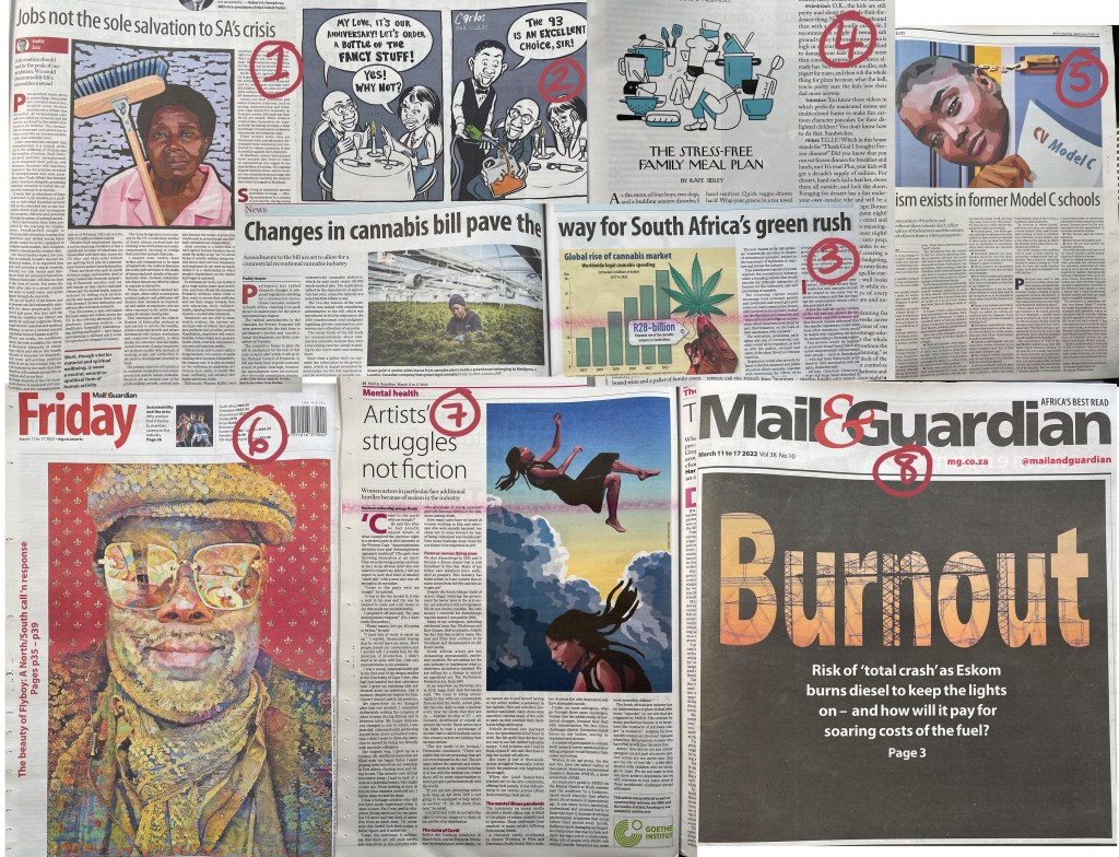 - “Burnout” is an illustration on the front page. The illustrator combines text with graphic elements to convey a representational image of the energy crisis in South Africa.