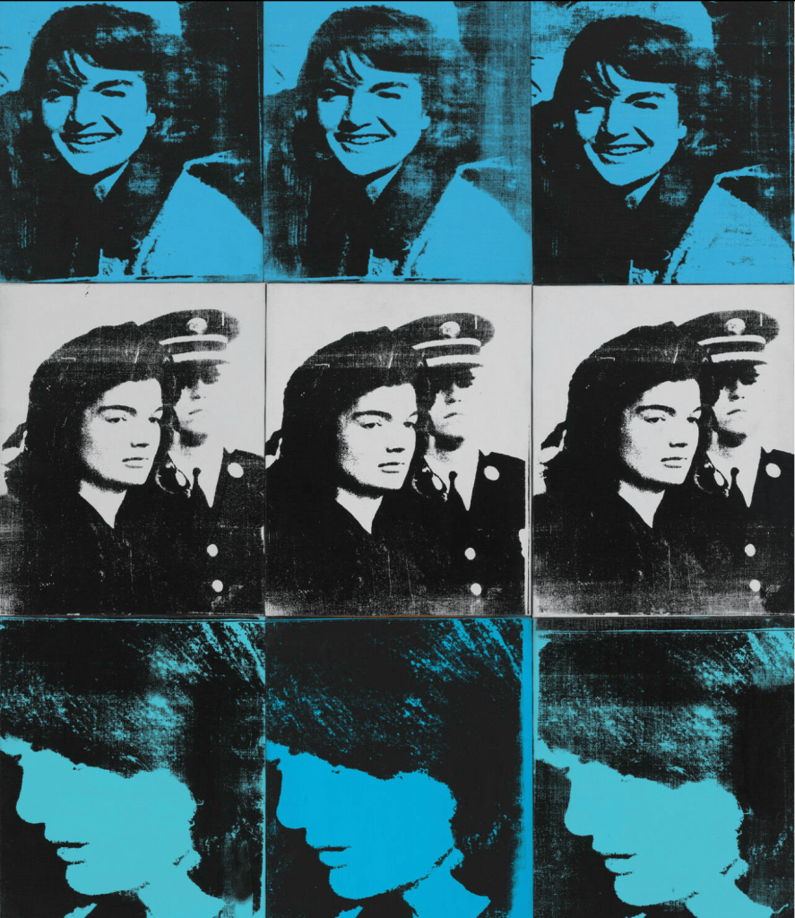 “In 1964, Andy Warhol appropriated newspaper photographs of Jacqueline Kennedy for a series of dramatic paintings in which he depicted the moments before and after the assassination of her husband, President John F. Kennedy. The top row of Nine Jackies features a smiling Jackie, the President’s face barely visible to her left. The image stands in juxtaposition to the shot that appears in the painting’s middle row, taken during the ceremony in which Kennedy’s flag-draped coffin was carried to the Capitol, and to the bottom row picture, snapped as a grief-stricken Jackie stood by Lyndon B.” (Whitney Museum , 2022)