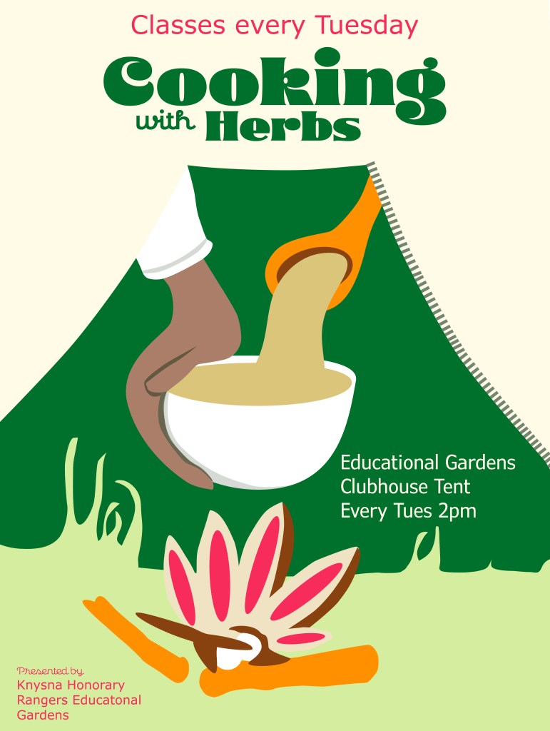 The cooking classes are during the winter school holidays in July, and it will be on my original route at the Educational Gardens near the Seahorse Project Aquarium. The cooking classes are to create conservation awareness of indigenous herbs and plants.