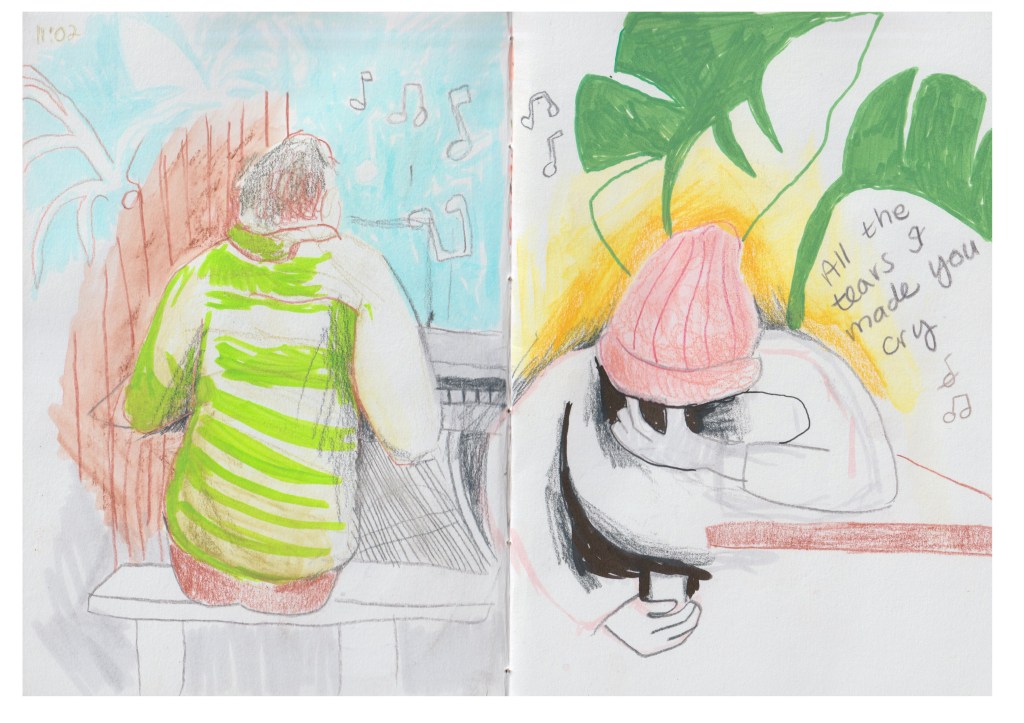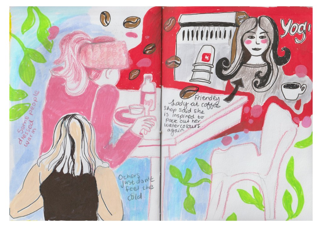 At this point, I ran out of time. I have been drawing for three hours now, half an hour of which was spent getting coffee and chatting with people. I still have two spreads and one single page to fill in my sketchbook, so I will take photos and continue drawing at home. I expected to fill the book in at least three hours, but I think that will come with practice.