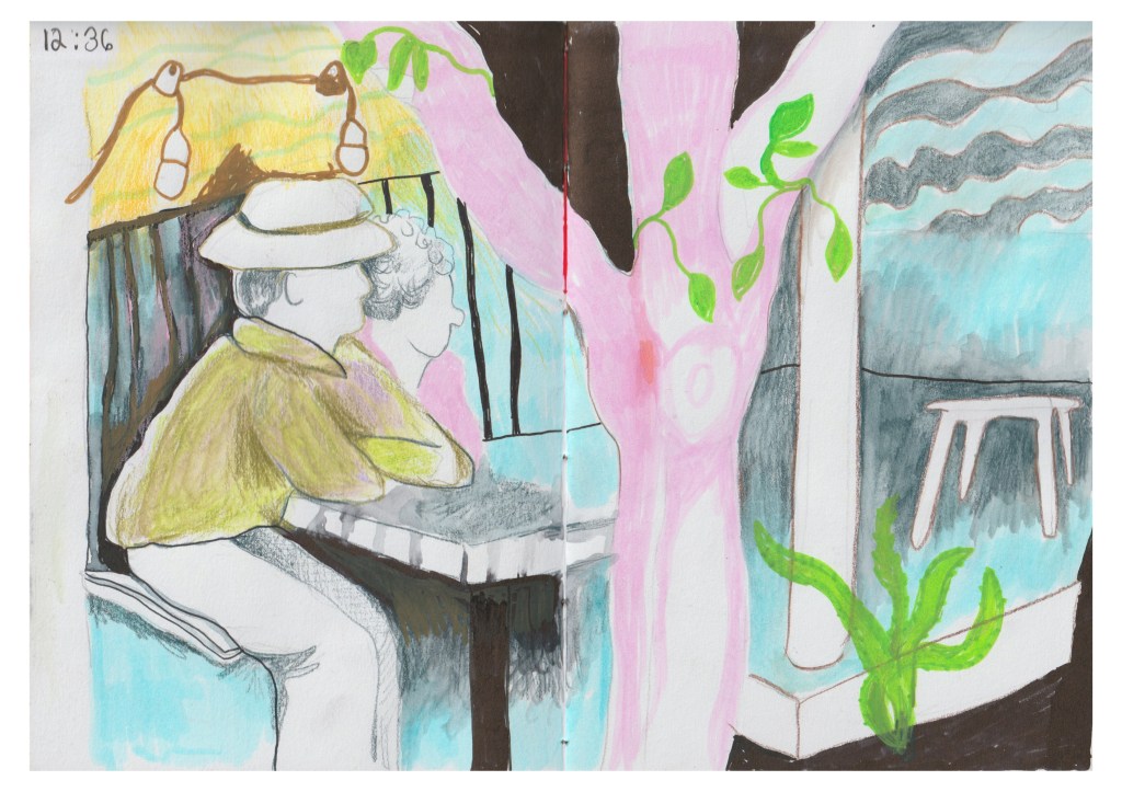Two ladies were sitting behind me, gossiping about the younger woman’s mother. While drawing, I could follow the entire conversation of this older lady instigating a quarrel between her younger friend and her mother. I would not dare to turn around to try and capture an image on paper, but I could certainly draw something conceptual or abstract to tell this story. Experiences like this, the weather, the atmosphere, music and smells are things you won’t experience in a studio setting.