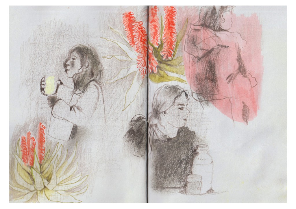 It is winter in South Africa, and the mornings can be very cold, but it warms up when the sun comes out. I notice an elderly lady from afar sitting in a few warm sunrays while she’s eating her breakfast. She was sitting at one of the tables under a tree. I then noticed the organic market emblem on the wall and thought it would be good to have that on my first page to set the theme of the sketchbook.