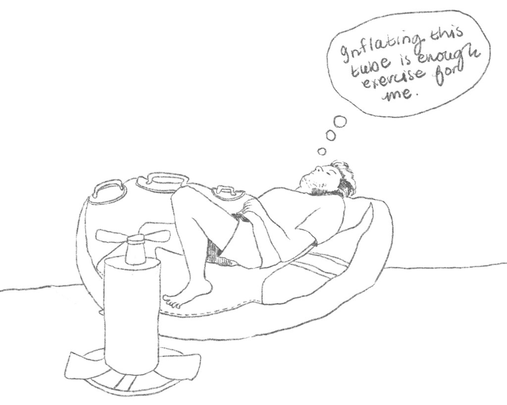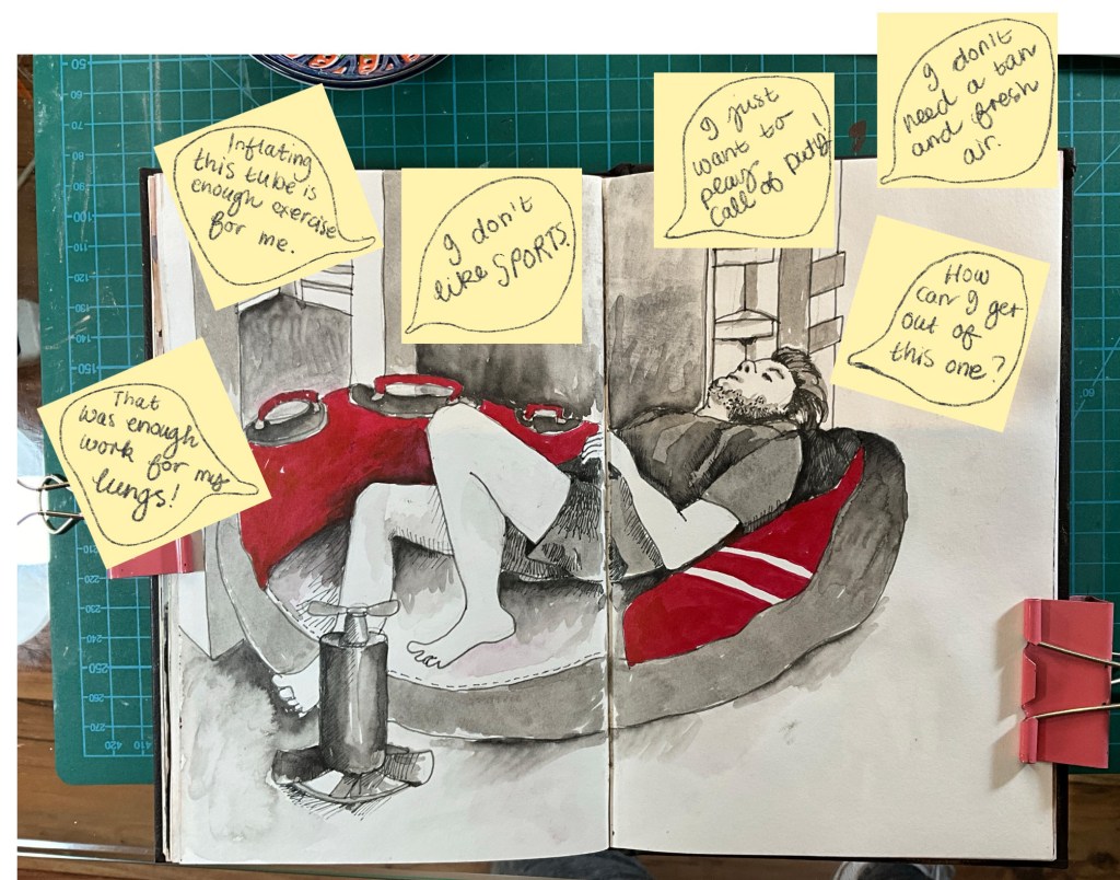 I came up with a few Post-its that he might be thinking about while lying there on the tube, such as: “That was enough work for my lungs”, “Inflating this tube was enough exercise for me”, “I don’t like sports”, “I just want to play Call-of-Duty”, “I don’t need a tan and fresh air”, “How can I get out of this one?”.