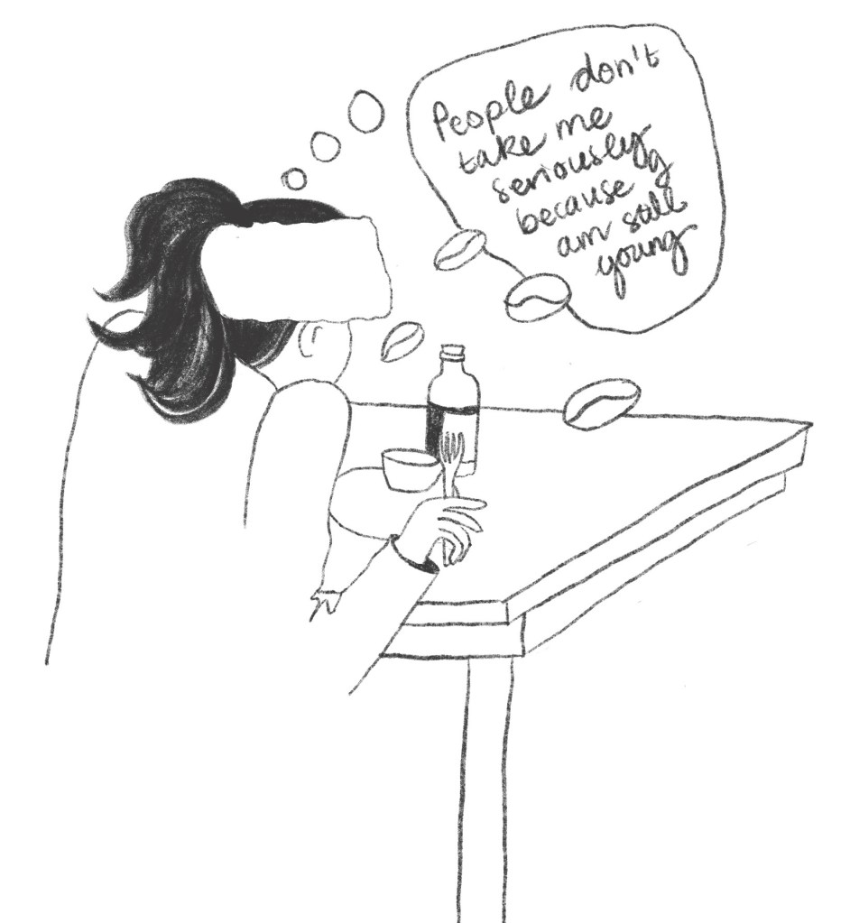 The next sketch in Figure 5 was done at the organic market. It shows a lady taking her lunch break. Phrases such as, “Coffee is not going to do it; I need something stronger.”, “I wish I could sit here all day.”, “People don’t take me seriously because I look too young”, and “How can a person be so dramatic about furniture?” are thoughts that could be playing in her mind. This tells the viewer that she is a working lady with typical corporate problems.