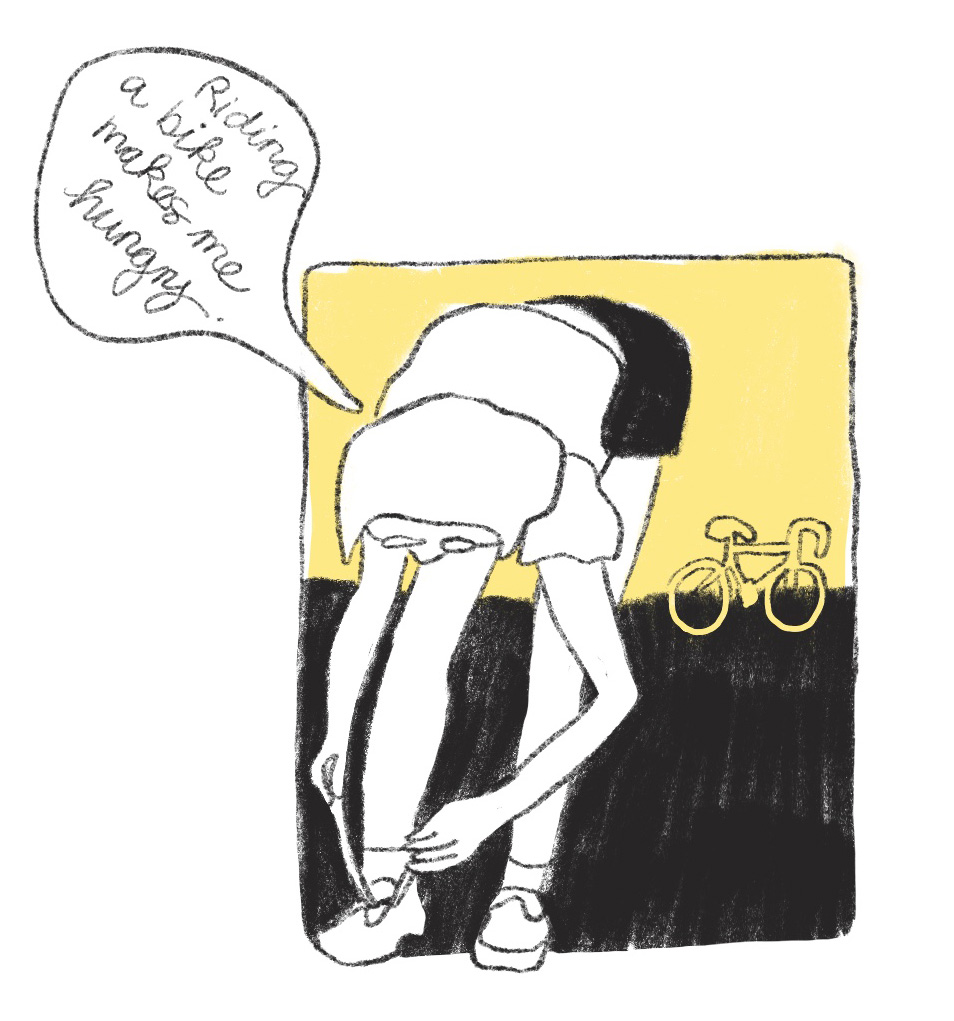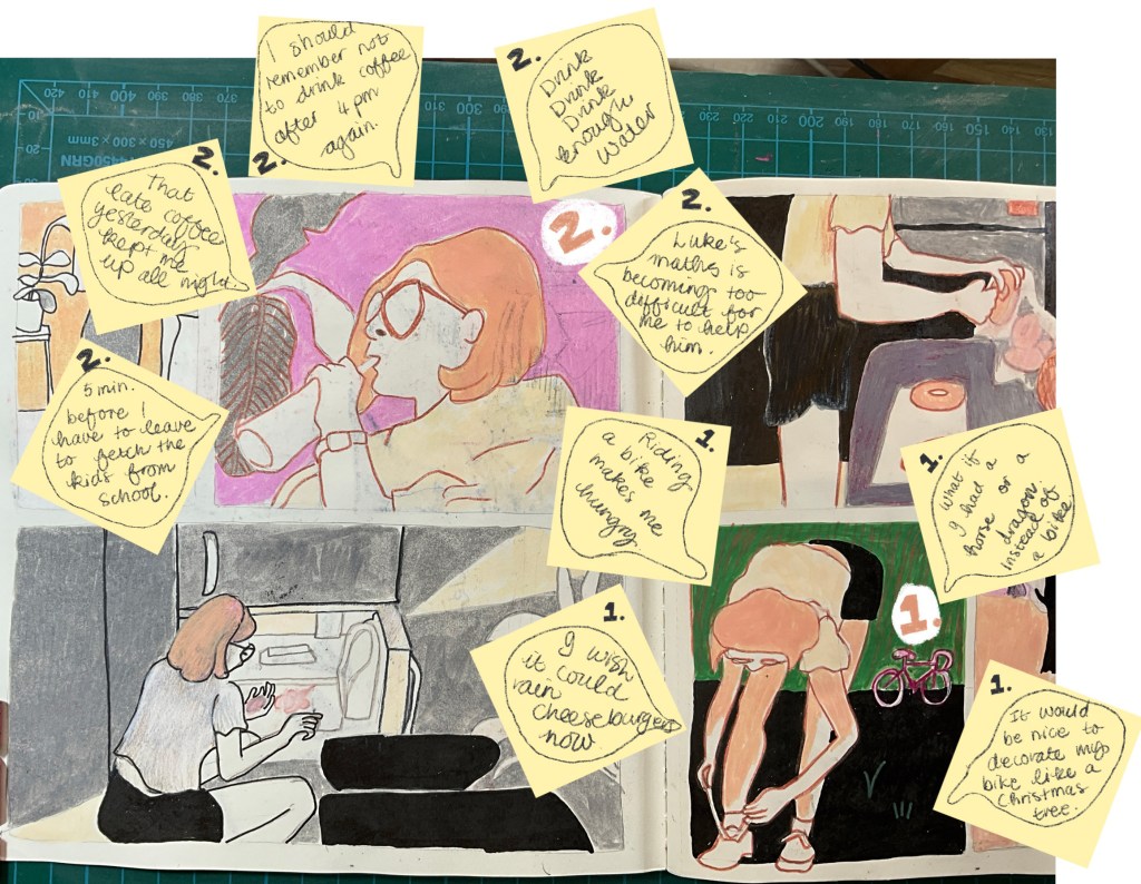 In Figure 7, on the right is a lady tying her shoes. Her bicycle is in the background, so the sketch already gives you the information that she is going to ride her bike. Here are some of the phrases I came up with: “Riding a bike makes me hungry.”, “I wish it could rain cheeseburgers!”, “What if I had a horse or a dragon instead of a bike.”, “It would be nice to decorate my bike like a Christmas tree.” All these phrases deepen the narrative, which could result in a frame before and after this frame to sketch the picture she has in her thoughts.