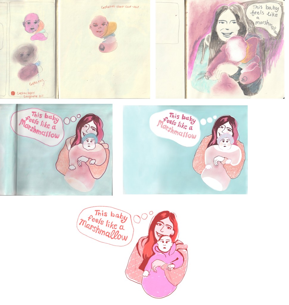 I continued with the Post-it notes in another spread in my sketchbook (Figure 10). I then finished a sketch in my sketchbook using the phrase, “This baby feels like a marshmallow.” I experimented with cut-outs and materials to make the baby look like a marshmallow to reflect what the woman was thinking.