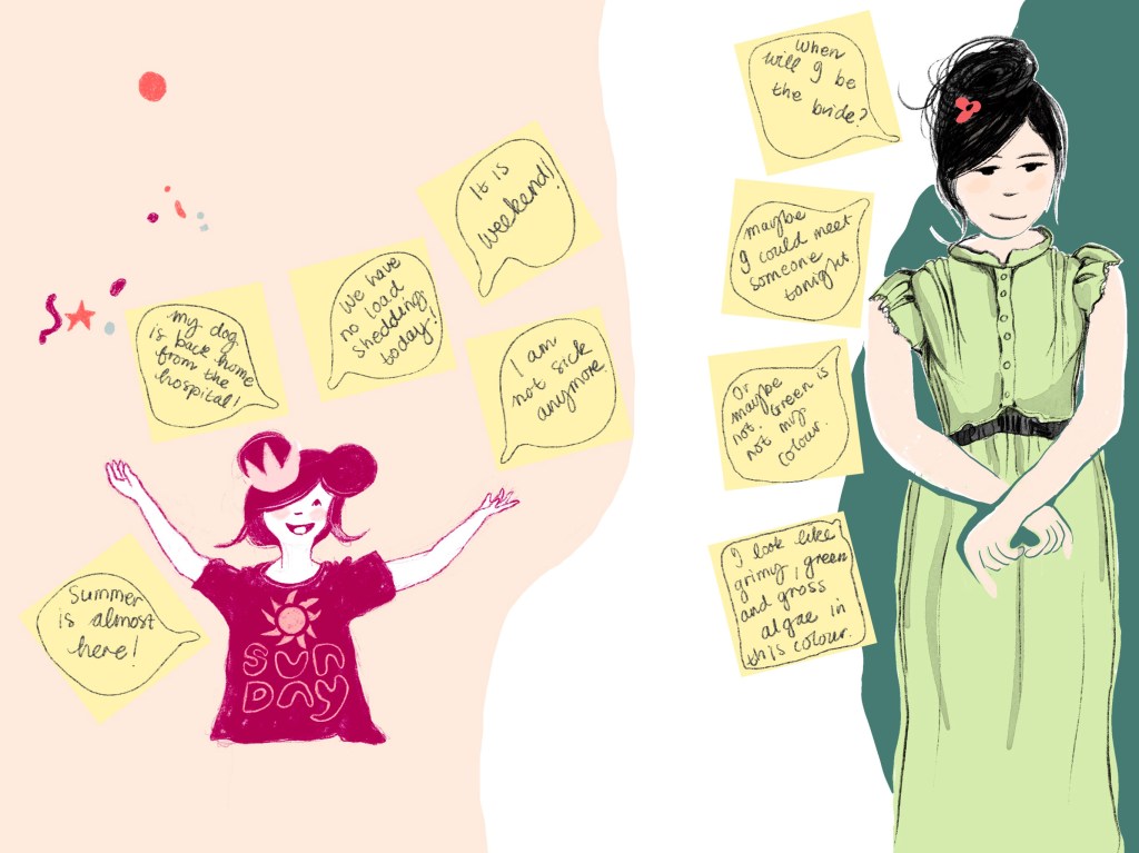 The green character is thinking about phrases like, “When will I be the bride?”, “Maybe I could meet someone tonight.”, “Green is not my colour.”, “I look like grimy, green and gross algae in this colour.”