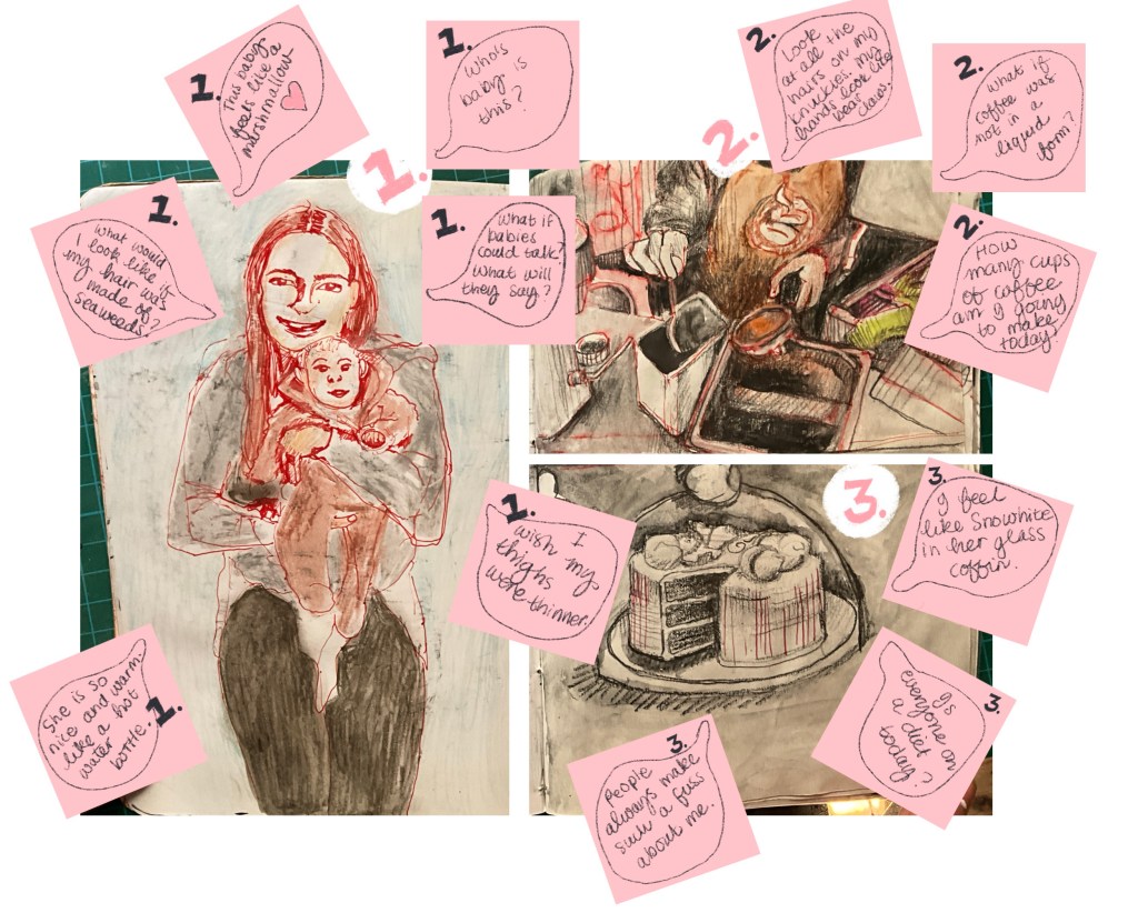 Use post-it notes or anything you can lightly tack to your earlier sketchbook work and add dialogue to a selection of these to suggest what these ‘characters’ might be thinking. Are they considering something in the near space? Think distantly about the future/past or later on in the day.