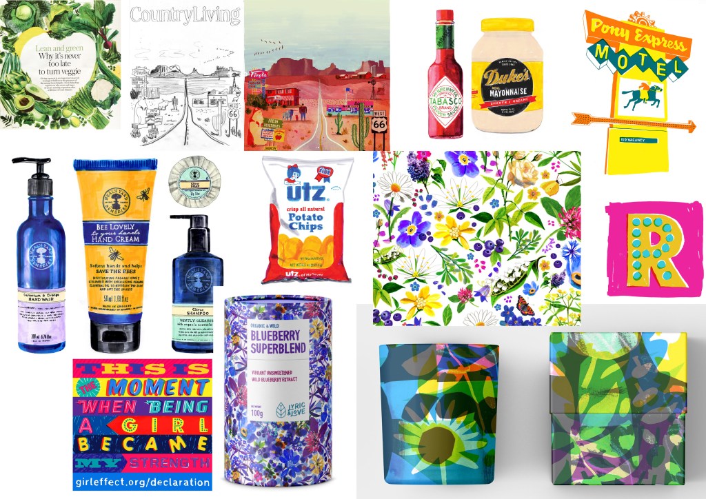 Holly Wales’s work has a bold design aesthetic with overlapping colours to create depth in her work. The marker textures of her illustrations create dramatic and expansive designs with decorative and stylised qualities. Wales works in many categories such as beauty and cosmetics, building and architecture, food and drink, lettering and surface design.