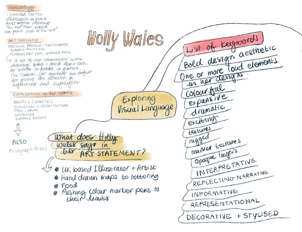 Write a short statement of no more than 200 words, to describe their work and visual language. What connections do you think exist between their sketchbook and their creative identity or illustrative style?