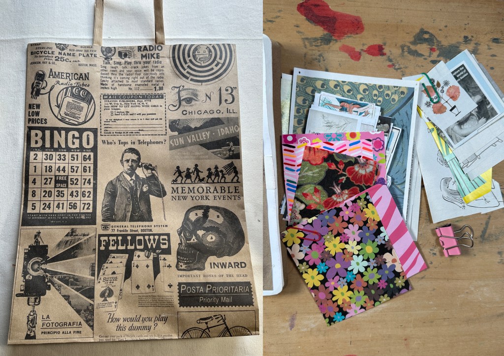 Now that I have a few connection ideas, I am going to explore how they work in making collages. I was also going to use some wrapping paper that I collected in my sketchbook and a carrier bag that I had saved.