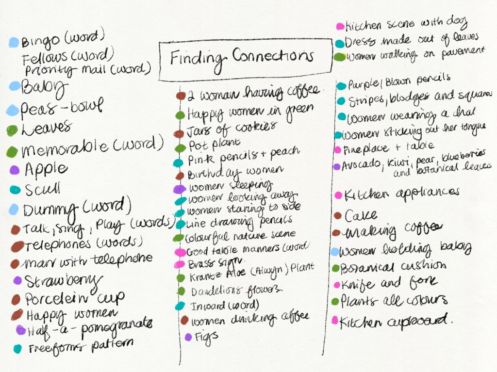 I colour-coded the possible connections I could see to help organise my thoughts and find ideas.