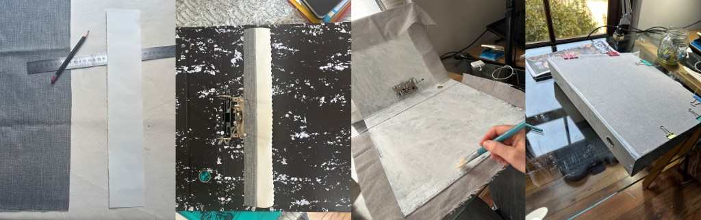 But I don’t want a regular lever arch file where I punch holes in my artwork and ‘file’ it. So, I have thought of creating a long strip tab, half of which is covered in fabric to give it extra durability. The other half is a paper tab for attaching visual material.